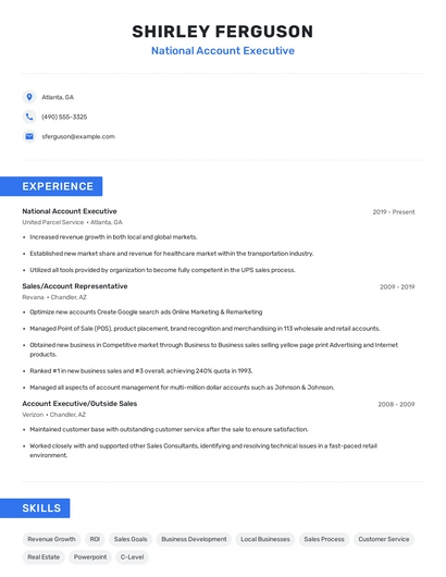 Build a professional national account executive resume in minutes. Browse through our resume examples to identify the best way to word your resume. Then choose from 5+ resume templates to create your national account executive resume.