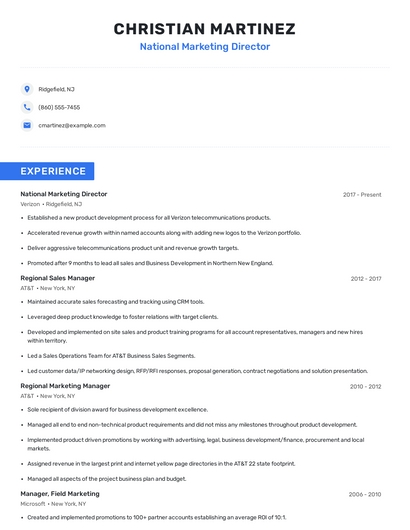 Build a professional national marketing director resume in minutes. Browse through our resume examples to identify the best way to word your resume. Then choose from 5+ resume templates to create your national marketing director resume.