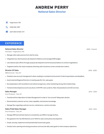 Build a professional national sales director resume in minutes. Browse through our resume examples to identify the best way to word your resume. Then choose from 5+ resume templates to create your national sales director resume.