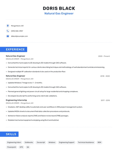 Build a professional natural gas engineer resume in minutes. Our AI resume writing assistant will guide you through every step of the process, and you can choose from 10+ resume templates to create your natural gas engineer resume.7. DOT