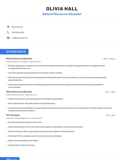 Build a professional natural resource educator resume in minutes. Our AI resume writing assistant will guide you through every step of the process, and you can choose from 10+ resume templates to create your natural resource educator resume.What skills help Natural Resource Educators find jobs?