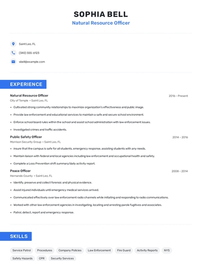 Build a professional natural resource officer resume in minutes. Browse through our resume examples to identify the best way to word your resume. Then choose from 5+ resume templates to create your natural resource officer resume.