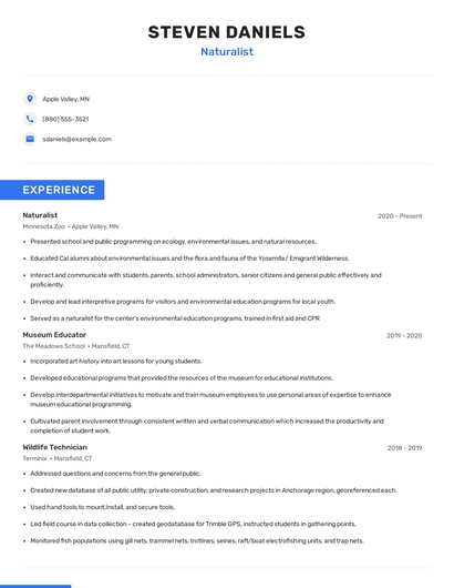 Build a professional naturalist resume in minutes. Browse through our resume examples to identify the best way to word your resume. Then choose from 5+ resume templates to create your naturalist resume.