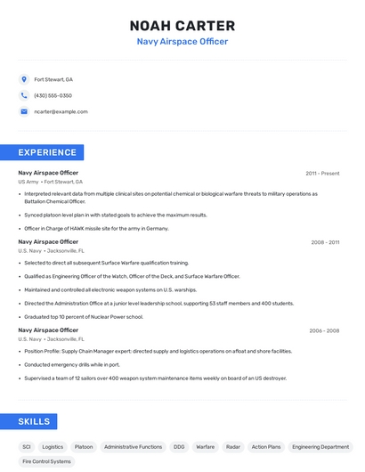 The most important skills for a navy airspace officer resume and required skills for a navy airspace officer to have include: