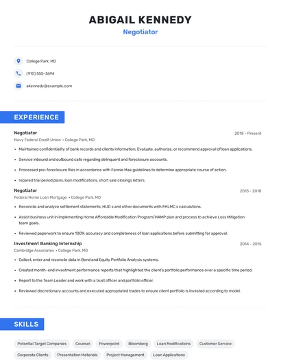 Build a professional negotiator resume in minutes. Browse through our resume examples to identify the best way to word your resume. Then choose from 5+ resume templates to create your negotiator resume.