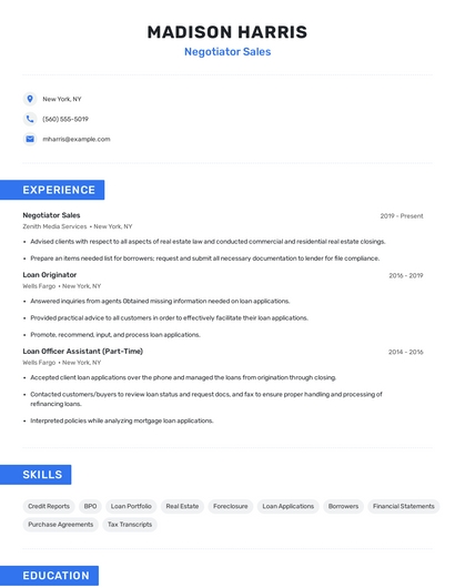 Build a professional negotiator sales resume in minutes. Browse through our resume examples to identify the best way to word your resume. Then choose from 5+ resume templates to create your negotiator sales resume.