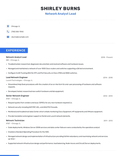 Build a professional network analyst lead resume in minutes. Browse through our resume examples to identify the best way to word your resume. Then choose from 5+ resume templates to create your network analyst lead resume.