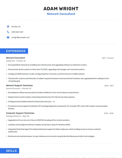 Build a professional network consultant resume in minutes. Browse through our resume examples to identify the best way to word your resume. Then choose from 5+ resume templates to create your network consultant resume.