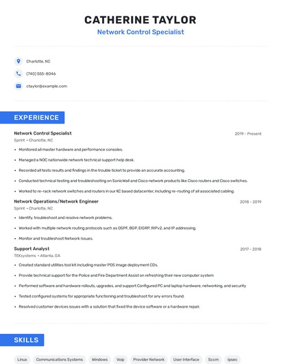 Build a professional network control specialist resume in minutes. Browse through our resume examples to identify the best way to word your resume. Then choose from 5+ resume templates to create your network control specialist resume.