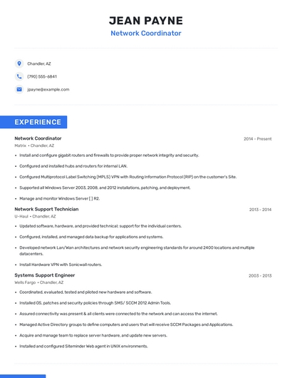 Build a professional network coordinator resume in minutes. Browse through our resume examples to identify the best way to word your resume. Then choose from 5+ resume templates to create your network coordinator resume.