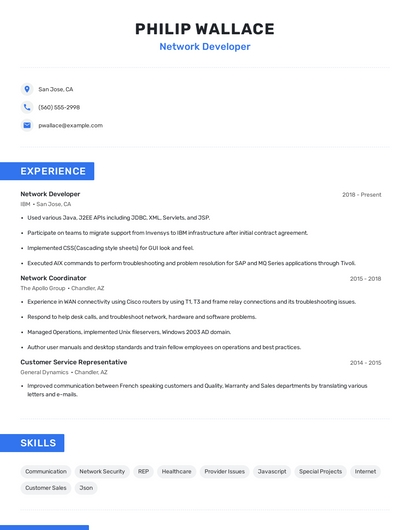 Build a professional network developer resume in minutes. Browse through our resume examples to identify the best way to word your resume. Then choose from 5+ resume templates to create your network developer resume.
