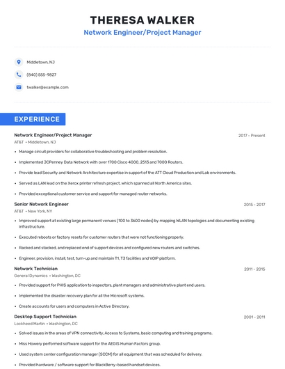Build a professional network engineer/project manager resume in minutes. Browse through our resume examples to identify the best way to word your resume. Then choose from 5+ resume templates to create your network engineer/project manager resume.