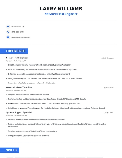 Build a professional network field engineer resume in minutes. Browse through our resume examples to identify the best way to word your resume. Then choose from 5+ resume templates to create your network field engineer resume.