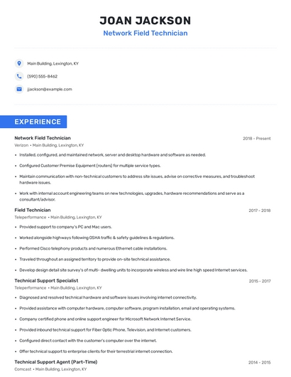 Build a professional network field technician resume in minutes. Browse through our resume examples to identify the best way to word your resume. Then choose from 5+ resume templates to create your network field technician resume.