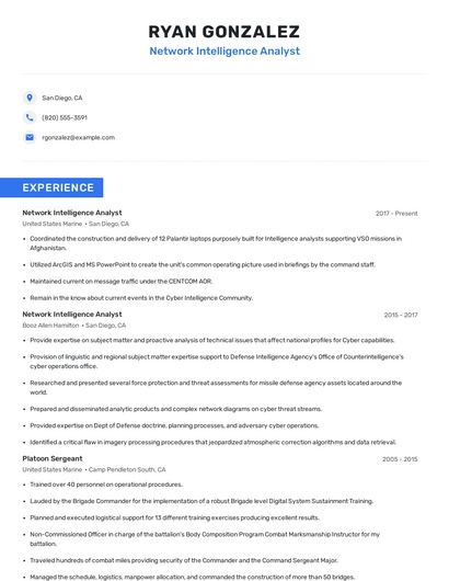 Build a professional network intelligence analyst resume in minutes. Browse through our resume examples to identify the best way to word your resume. Then choose from 5+ resume templates to create your network intelligence analyst resume.