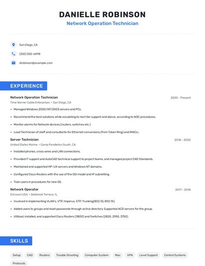 Build a professional network operation technician resume in minutes. Browse through our resume examples to identify the best way to word your resume. Then choose from 5+ resume templates to create your network operation technician resume.