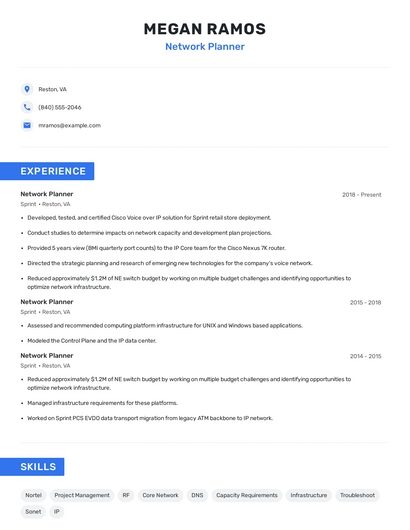 Build a professional network planner resume in minutes. Browse through our resume examples to identify the best way to word your resume. Then choose from 5+ resume templates to create your network planner resume.