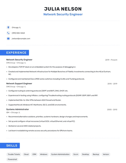 Build a professional network security engineer resume in minutes. Browse through our resume examples to identify the best way to word your resume. Then choose from 5+ resume templates to create your network security engineer resume.