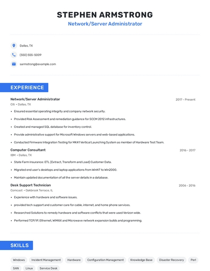 Build a professional network/server administrator resume in minutes. Browse through our resume examples to identify the best way to word your resume. Then choose from 5+ resume templates to create your network/server administrator resume.