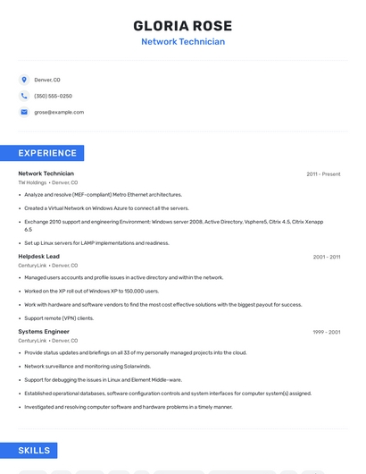 Build a professional network technician resume in minutes. Browse through our resume examples to identify the best way to word your resume. Then choose from 5+ resume templates to create your network technician resume.