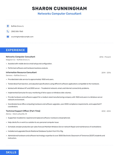 Build a professional networks computer consultant resume in minutes. Our AI resume writing assistant will guide you through every step of the process, and you can choose from 10+ resume templates to create your networks computer consultant resume.7. Linux