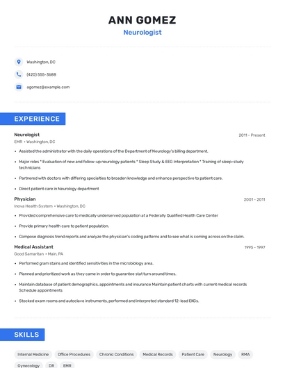 Build a professional neurologist resume in minutes. Browse through our resume examples to identify the best way to word your resume. Then choose from 5+ resume templates to create your neurologist resume.