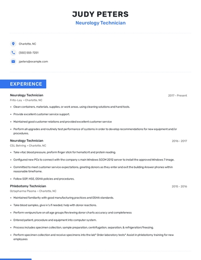 Build a professional neurology technician resume in minutes. Browse through our resume examples to identify the best way to word your resume. Then choose from 5+ resume templates to create your neurology technician resume.