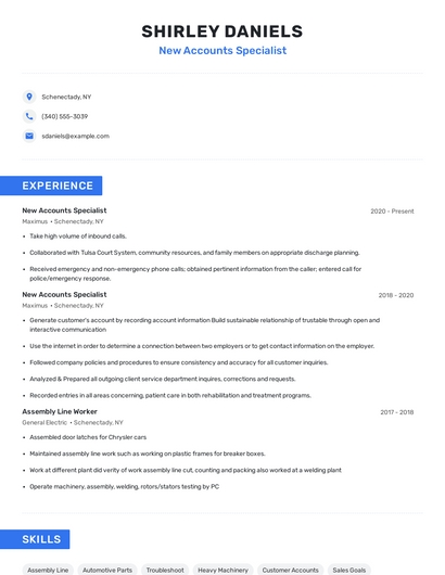 Build a professional new accounts specialist resume in minutes. Browse through our resume examples to identify the best way to word your resume. Then choose from 5+ resume templates to create your new accounts specialist resume.