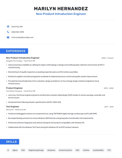 Build a professional new product introduction engineer resume in minutes. Browse through our resume examples to identify the best way to word your resume. Then choose from 5+ resume templates to create your new product introduction engineer resume.
