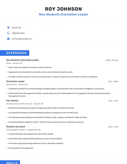 Build a professional new students orientation leader resume in minutes. Browse through our resume examples to identify the best way to word your resume. Then choose from 5+ resume templates to create your new students orientation leader resume.
