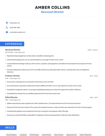 Build a professional newscast director resume in minutes. Browse through our resume examples to identify the best way to word your resume. Then choose from 5+ resume templates to create your newscast director resume.