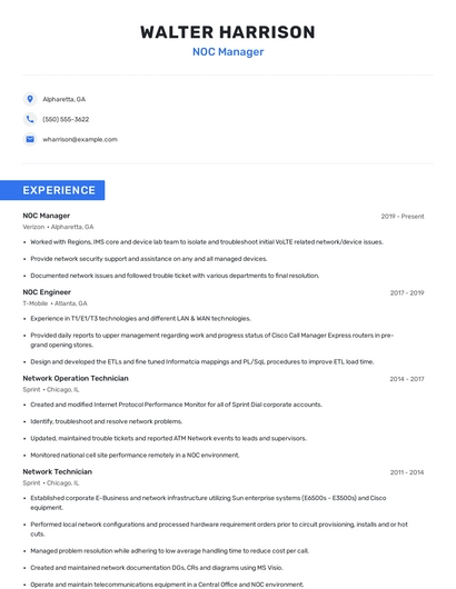 Build a professional noc manager resume in minutes. Our AI resume writing assistant will guide you through every step of the process, and you can choose from 10+ resume templates to create your noc manager resume.7. Technical Support