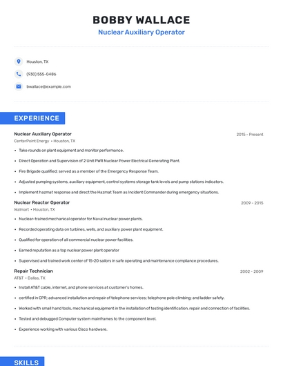 Build a professional nuclear auxiliary operator resume in minutes. Our AI resume writing assistant will guide you through every step of the process, and you can choose from 10+ resume templates to create your nuclear auxiliary operator resume.7. Nuclear Power