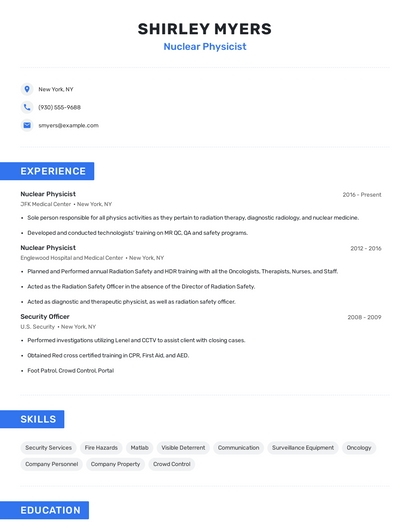 Build a professional nuclear physicist resume in minutes. Our AI resume writing assistant will guide you through every step of the process, and you can choose from 10+ resume templates to create your nuclear physicist resume.What skills help Nuclear Physicists find jobs?