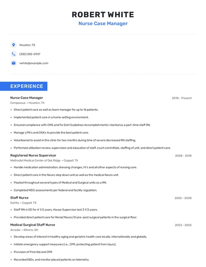 Build a professional nurse case manager resume in minutes. Browse through our resume examples to identify the best way to word your resume. Then choose from 5+ resume templates to create your nurse case manager resume.