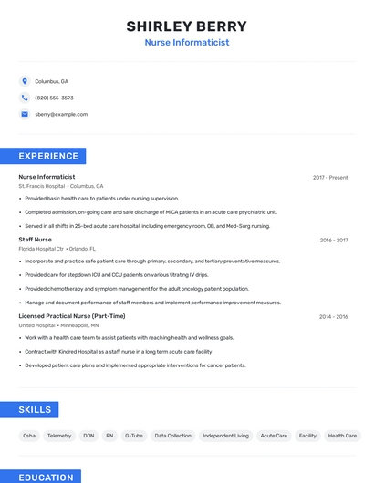 Build a professional nurse informaticist resume in minutes. Browse through our resume examples to identify the best way to word your resume. Then choose from 5+ resume templates to create your nurse informaticist resume.