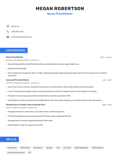 Build a professional nurse practitioner resume in minutes. Browse through our resume examples to identify the best way to word your resume. Then choose from 5+ resume templates to create your nurse practitioner resume.