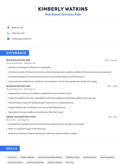 Build a professional nutritional services aide resume in minutes. Browse through our resume examples to identify the best way to word your resume. Then choose from 5+ resume templates to create your nutritional services aide resume.