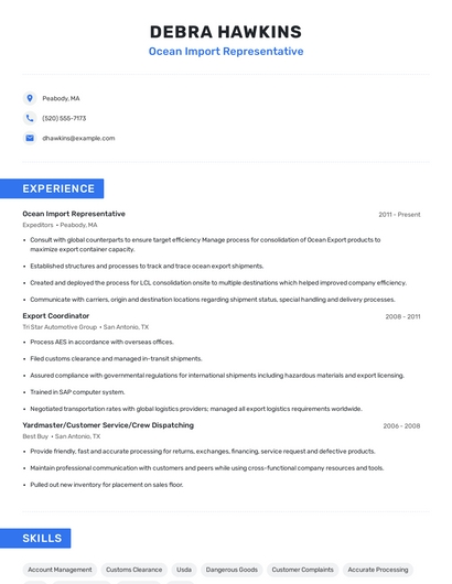 Build a professional ocean import representative resume in minutes. Our AI resume writing assistant will guide you through every step of the process, and you can choose from 10+ resume templates to create your ocean import representative resume.7. US Customs
