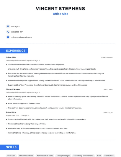 Build a professional office aide resume in minutes. Browse through our resume examples to identify the best way to word your resume. Then choose from 5+ resume templates to create your office aide resume.