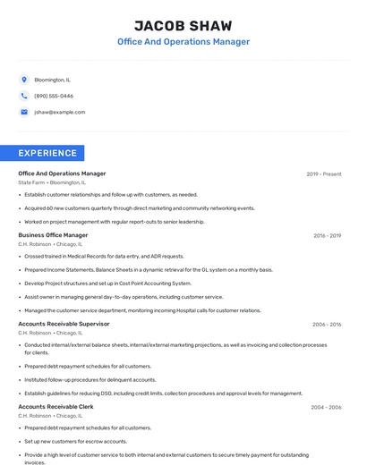 Build a professional office and operations manager resume in minutes. Browse through our resume examples to identify the best way to word your resume. Then choose from 5+ resume templates to create your office and operations manager resume.