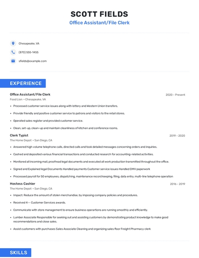 Build a professional office assistant/file clerk resume in minutes. Browse through our resume examples to identify the best way to word your resume. Then choose from 5+ resume templates to create your office assistant/file clerk resume.