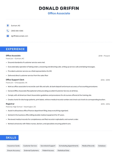 Build a professional office associate resume in minutes. Browse through our resume examples to identify the best way to word your resume. Then choose from 5+ resume templates to create your office associate resume.