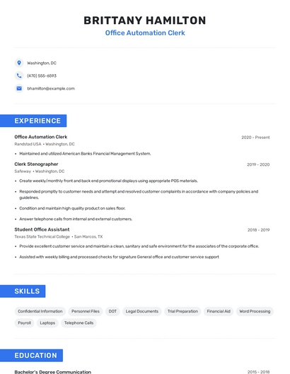 Build a professional office automation clerk resume in minutes. Browse through our resume examples to identify the best way to word your resume. Then choose from 5+ resume templates to create your office automation clerk resume.