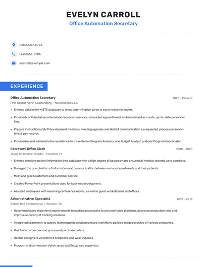 Build a professional office automation secretary resume in minutes. Browse through our resume examples to identify the best way to word your resume. Then choose from 5+ resume templates to create your office automation secretary resume.