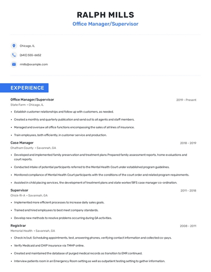 Build a professional office manager/supervisor resume in minutes. Browse through our resume examples to identify the best way to word your resume. Then choose from 5+ resume templates to create your office manager/supervisor resume.