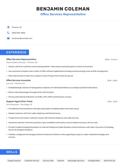 Build a professional office services representative resume in minutes. Browse through our resume examples to identify the best way to word your resume. Then choose from 5+ resume templates to create your office services representative resume.