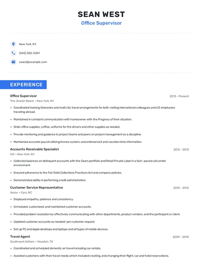 Build a professional office supervisor resume in minutes. Browse through our resume examples to identify the best way to word your resume. Then choose from 5+ resume templates to create your office supervisor resume.