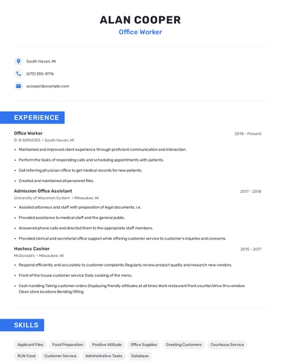 Build a professional office worker resume in minutes. Browse through our resume examples to identify the best way to word your resume. Then choose from 5+ resume templates to create your office worker resume.