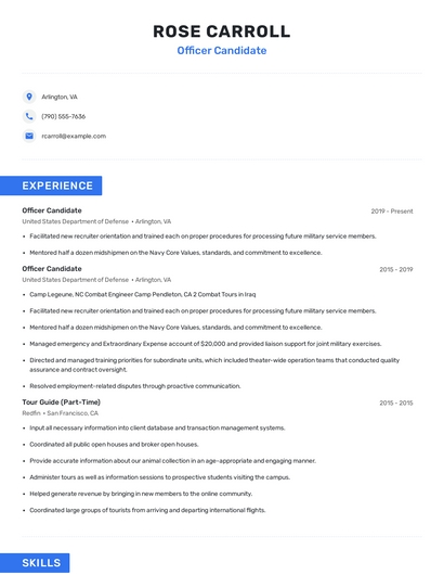 Build a professional officer candidate resume in minutes. Browse through our resume examples to identify the best way to word your resume. Then choose from 5+ resume templates to create your officer candidate resume.